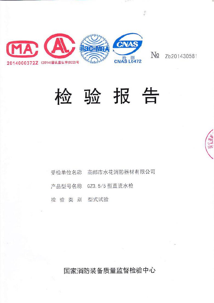 I plant was founded in June 1976, the existing staff of 600 people,including all kinds of technical and management staff of 68 people.With 50 millon yuan in fixed assets,covers an area of over 35,000 square meters,construction area of over 25,000 square meters.The establishment of a sound quality system. made a variety of "measurement of qualified certification",and become Jiangsu and more provinces of the fire association member units.Factory strong technical force,production and testing equipment,advanced technology.Production "water flower"brand water with intertace:KDK65,KD65,KY65,KN65.Fire water gun:QZG3.5/7.5,QZ3.5/7.5,QP8/0.7Z foam water gun.Indoor fire hydrant:SN65,SNW65-1,SNZ65,SNZW65-1.Fire hose reel JPS0.8-19/25.Production of "postal" card,fire with lining water:65-8,10,13.16,20,25 type;80-16,20,25 type.Water interface:KD50,65;KY50,65;KN65.Fire water gun:QZ3.5/7.5.5.Indoor fire hydrant:SN65,SNW65-1,SNZ65,SNZW65-I.And in May 2015 through the Ministry of Public Security Fire Product Conformity Assessment Center 3C version of the inspection access to all of the above products,mandatory certification,to allow the production and marketing,product marketing throughout the country,praised by the majority of users.